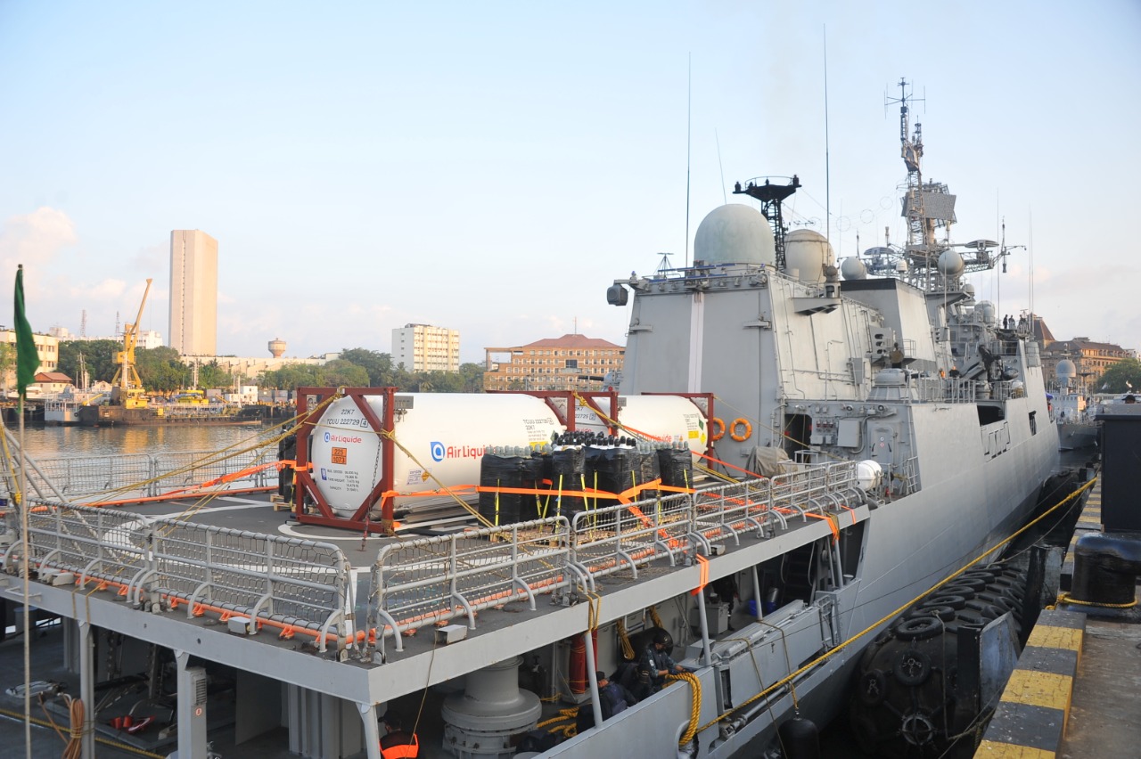 According to the update shared by the Indian Navy on May 12, 2021, INS Tarkash, has arrived in Mumbai with a consignment of two Liquid Medical Oxygen (LMO) filled (20 MT each) cryogenic containers and 230 Oxygen cylinders. These have been handed over to the Civil Administration, Maharashtra.