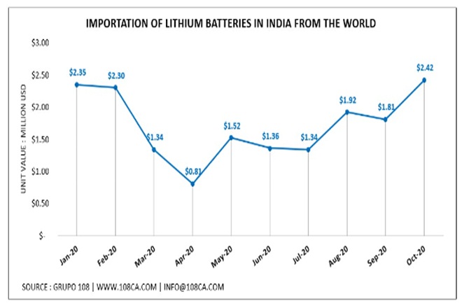 In 2020 (January-October), India imported nearly USD17.18 million valued Lithium batteries. Info-graph below shows per month importation of Lithium Batteries in India. However, the importation of Lithium Batteries dropped in March-20till July-20, but it is due to the global Pandemic lockdown.