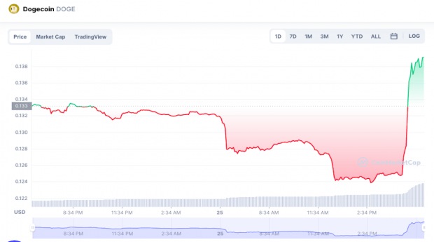 At 12 am on April 25th, DOGE was trading at around $0.1324. The price fell to as low as $0.1239 by 2PM on Monday. At the time of press, DOGE had recovered price and market cap, jumping by around 4.2% to $0.139