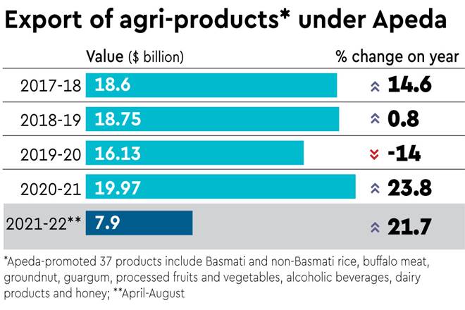 Exports of these products grew 24% to $20 billion during FY21 on a low base; though the year saw the pandemic and global prices of the most items remained elevated. Apeda is eyeing 10-15% rise in exports this year; the estimate is conservative because a possible decline in global prices is factored in.