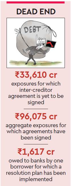 Based on a survey of 13 banks with regard to assets that were initially assigned to be resolved through the prudential framework as of June 30, 2019, an ICA is yet to be signed for exposures amounting to Rs 33,610 crore. Agreements have been signed with respect to aggregate exposures of Rs 96,075 crore. A resolution plan has been implemented only for one borrower which owes banks around Rs 1,617 crore.