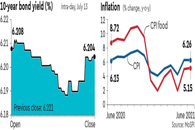 Bond yields remained steady on Tuesday on better than expected retail inflation data for June, which eased marginally to 6.26% in June from 6.30% in May. The marginal fall in inflation eased the market’s fear of rate normalisation by the Reserve Bank of India.