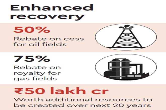 With a view to ramping up production from ageing hydrocarbon fields, the Cabinet on Wednesday approved a policy to incentivise enhanced and improved recovery (ER/IR) methods for oil and gas, and unconventional hydrocarbons (UHCs). Explorers who deploy such techniques on oil fields will get a rebate of 50% on cess and gas fields will get 75% rebate on royalty payment to the government. Addressing the media, petroleum minister Dharmendra Pradhan said if 5% of oil and gas production increases from the existing fields, in the next 20 years the country will be able to get additional resources to the tune of Rs 50 lakh crore.