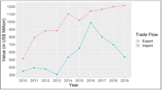 Since 2010, there has been a steady rise in Indian exports to Central America, with exports reaching nearly US$ 1.2 billion in 2019. On the other hand, the imports from Central America have fluctuated, with an overall rise of more than US$ 600 million being observed from 2010 to 2016, followed by a sharp decline of 45% from 2016 to 2019. A growth of 33% in imports was observed between 2015 and 2016, mainly attributed to a boost in Gold imports from the Dominican Republic, which showed an increase of 25.83% from US$ 378.87 million in 2015 to US$ 510.86 million in 2016, and a massive growth in Tanker imports (ships designed to transport or store liquids or gases in bulk), from Panama, increasing from US$ 27.18 million in 2015 to US$ 140.85 million in 2016.