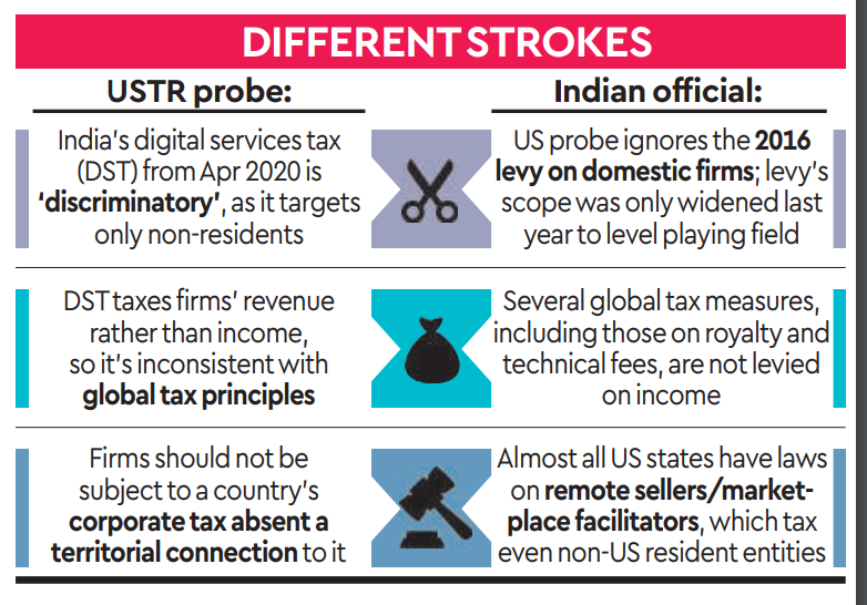 Earlier, the equalisation levy (at 6%) was introduced in 2016 and slapped on the revenues generated on business-to-business digital advertisements and allied services of the resident service provider. The levy is designed to nullify the advantage of foreign-commerce firms sans a physical presence in India over local competitors. The USTR probe argues that the levy taxes companies’ revenue rather than income, so it’s inconsistent with international tax principles. But the Indian official points out that several international tax measures such as tax on royalty and on technical fees are levied on revenues received as royalty or fees for technical services. Similarly, the US probe seems to argue that companies should not be subject to a country’s corporate tax regime absent a territorial connection to it. But the Indian official said as many as 50 of the 52 US states have enacted laws on taxation of remote sellers and marketplace facilitators, which tax entities that are not US residents.