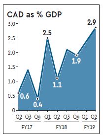 The widening of the current account deficit (CAD) was mainly owing to a big merchandise trade gap of $50 billion, up 50% from Q2FY18, which could not be offset by increases in net receipts from services trade and private remittances.