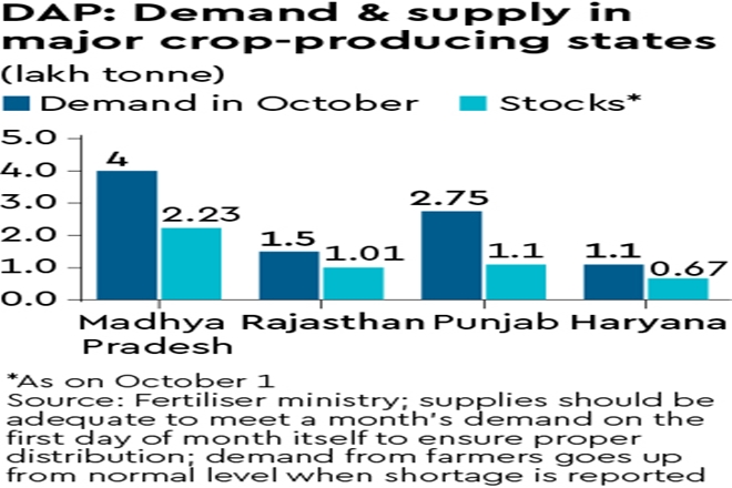 According to sources, the Centre has allocated only 67,000 tonne of DAP for Rajasthan during October against a demand of 1.5 lakh tonne; similarly, 2 lakh tonne for Punjab has been sanctioned against 5.5 lakh tonne required for the entire season. Madhya Pradesh has about 4 lakh tonne of DAP demand during October and is said to be facing a 30-40% shortage.
