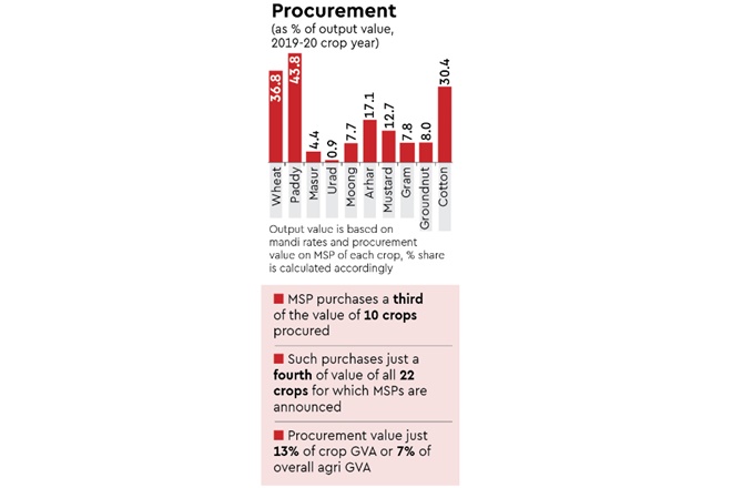 Since the overall output value of the agriculture and allied sector (which tends to be higher than its GVA) was expected to be around Rs 40 lakh crore in 2019-20, procurement made up for even a smaller fraction of it — just 6%.