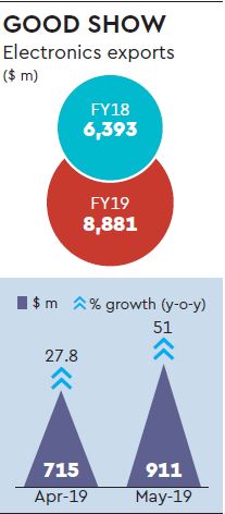 Having jumped 39% year-on-year to a record $8.9 billion in FY19, electronics exports surged 28% y-o-y in April to $715 million and an impressive 51% in May to $911 million, according to “quick estimates” by the commerce ministry. In contrast, total goods exports grew just 0.6% in April and 3.9% in May.