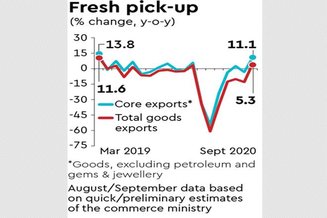 While these are still early days, the rebound in core exports in September points at a potential pick-up in external demand in the build-up to the crucial Christmas season, when orders from the key western markets — the US and the UK — flow in large volumes. Of course, some pent-up demand and despatches against orders firmed up before the pandemic may also have contributed to the decent rise. Nevertheless, these are encouraging signs, analysts concur.