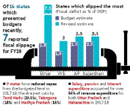 With the UDAY burden off, state governments in aggregate were expected to revert to well below 3% fiscal deficit in the current financial year, but an analysis by FE of 14 state budgets presented recently suggests they might not. As the year is drawing to a close, seven of these states have revised their FY18 fiscal deficits to be higher than projected a year ago, with the slippage ranging from a marginal 0.1 to profligate 4.63 percentage points.