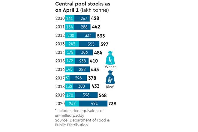 Foodgrain stocks in the central pool stood at 73.85 million tonne (mt) as on April 1, the highest ever for this date and three-and-a-half times the minimum operational-cum-strategic reserve requirement of 21.04 mt.