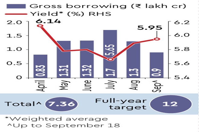 The government borrowed Rs 7.36 lakh crore from the market until September 18, which was 81% higher than a year before and represented 61% of the revised, full-year market borrowing limit, show the RBI data. After some moderation in May through July, the weighted average bond yield has started rising again, remaining close to the 6% mark since August 21. According to a CARE Ratings report, up to September 18, there had been three auctions, wherein the unaccepted amount had to be devolved to primary dealers.