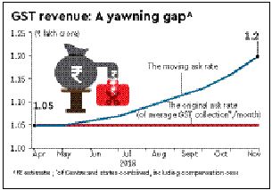 Based on the Centre’s budget estimates of CGST, IGST and compensation cess and assuming SGST to be equal to CGST minus budgeted compensation cess proceeds, the total GST collections required to meet the target is `12.57 lakh crore, or about `1.05 lakh crore a month. Against this, the average collection in April-November period was just `97,050 crore. This would mean that in the last four months of the fiscal, the total GST collections (Centre plus states) should be `4.8 lakh crore, or `1.2 lakh crore/month to meet the estimates.