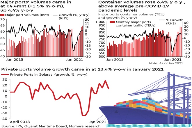 Major ports’ volumes grew by 4.4% y-y (+1.5% m-m) in Jan 2021, led by strong growth in container volumes (+6.4% y-y in tonnage terms) and POL volumes (up 3.1% y-y, the first month of y-y growth since Feb’20).