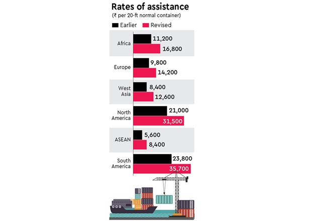 Rates of assistance have been increased by 50% for exports by sea and 100% for those by air. Similarly, dairy products, which were not covered under the earlier TMA scheme, will now be eligible for assistance, the commerce ministry said in a statement.