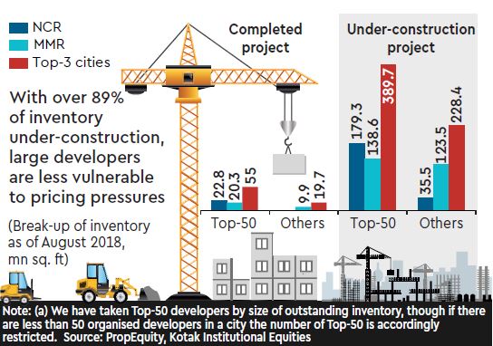 However, estimates suggest that a total of over 618 million sq ft of under-construction inventory is available with the developers in top three cities. The amount of completed inventory is in the range of 75 million sq ft, according to analysts at Kotak Institutional Equities. “We highlight that at current levels of sales, the extant inventory will take as much as 50 months to absorb. However, if incremental sales are directed towards completed inventory alone, then the current inventory can be absorbed within 5-6 months,” they said.