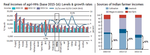Based on household-level data, NAFIS estimates that an average Indian farming household earned `8,931/month (`1,07, 172/year) in the agriculture year 2015-16. This is up from `2,115 earned in 2002-03 as per NSSO’s SAS, implying a compounded annual growth rate (CAGR) of about 12% in nominal terms and 3.7% in real terms (2015-16 base) in the thirteen years. One must, however, be cautious when comparing NSSO and NAFIS estimates. Because of a wider definition of rural areas—unlike NSSO, the NABARD survey includes areas that are bigger, including tiers 3,4 and 5—and a higher threshold level of income (`5,000) from agricultural and allied activities, while NSSO’s threshold income level is `3,000. This is likely to create an upward-bias in NAFIS estimates of farmers’ income.
