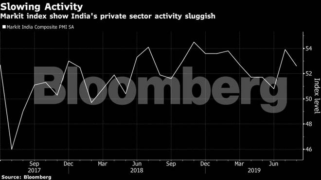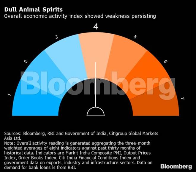 India’s economic growth showed little signs of a recovery from a six-year low, with investment and consumption activity in August remaining fairly subdued. The dial on a gauge measuring overall economic activity was stuck in the same position as the previous month, with two of the eight high-frequency indicators compiled by Bloomberg News showing weakness and five others staying steady. Car sales in August slumped the most on record while demand for bank loans weakened, underlining worsening consumer spending.