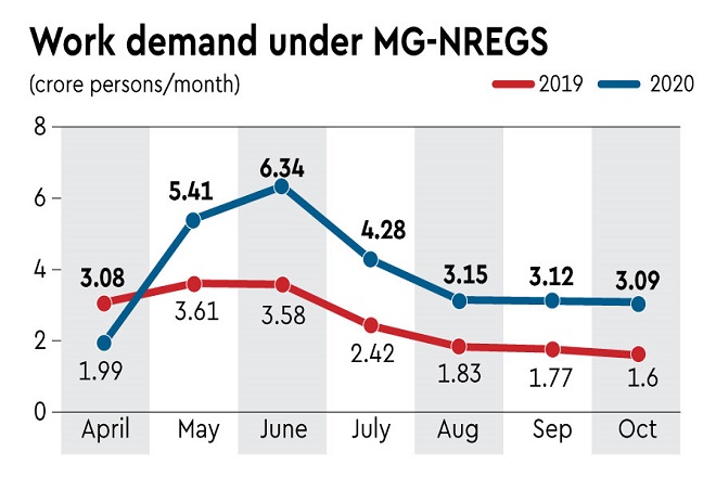 The data reflects the high efficacy of the popular scheme to avert a rural distress in the pandemic period that saw tens of thousands of migrant workers returning to their rural homes from cities. That the demand continues to be much higher than the year-ago level bears testimony to the economic sluggishness that is still prevailing in the urban and rural areas, rendering other opportunities for work unavailable.