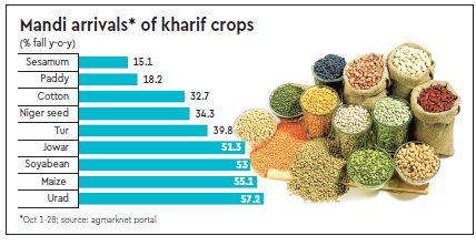 Arrivals of 11 major kharif crops such as paddy, maize, soyabean, tur and cotton were down 3-57% during October 1-28 compared with whole of October last year (see chart). For seven of 11 crops, the decline in arrivals was over 30%.