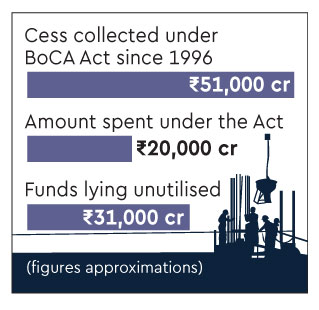 Labour ministry has estimated that around Rs 31,000 crore was lying unspent with the building and other construction workers (BoCW) welfare boards across all states. As per the Building and Other Construction Workers’ Welfare Cess Act, 1996, all construction activities incurring cost of above Rs 10 lakh are bound to deposit cess at 1% ( in some states, 2%) of the cost of construction to the state BoCW board. The cess is collected from government/public and private sectors.