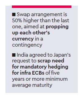 Separately, economic affairs secretary Subhash Chandra Garg said in a tweet: “Accepting Japanese request, India agreed to do away with requirement of mandatory hedging for infrastructure ECBs of 5 years or more minimum average maturity.” The swap agreement “will enable the agreed amount of foreign capital being available to India for use as and when need arises”, the finance ministry said.