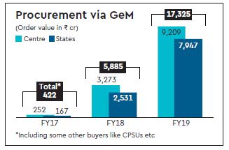 According to the latest official data, purchases by various states via GeM touched Rs 9,209 crore in 2018-19 against Rs 7,947 crore by the Central government. States such as Uttar Pradesh, Maharashtra and Madhya Pradesh are among the largest buyers on the GeM platform.However, at 9.03 lakh, the number of orders placed by the Central government was higher than that of state governments (3.93 lakh) in 2018-19, suggesting that states ordered more high-value items. Enthused by the response, GeM is now aiming to catalyse public procurement worth `50,000 crore (in terms of value of transactions) through its platform in 2019-20 against `17,325 crore in 2018-19 and `5,885 crore in the previous fiscal.The products and services available on the GeM platform are typically commonly-used ones that various Central government ministries and departments used to purchase through the erstwhile Directorate General of Supplies and Disposals (DGS&D), before the 100-year-old government procurement arm was wound up.