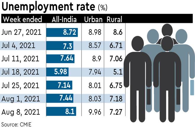 The country’s unemployment rate rose to a six-week high of 8.1% in the week ended August 8, according to data compiled by the Centre for Monitoring of Indian Economy (CMIE).
