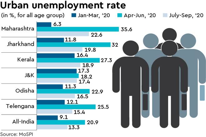 Kerala comes a close third recording a 27.3% rate of unemployment in the April-June 2020 period and 18.9% in July-September 2020 period. Jammu and Kashmir had the fourth highest unemployment rate at 17.4% during the July-September period of the last year followed by Odisha and Telengana at 16.5% and 15.4%, respectively.
