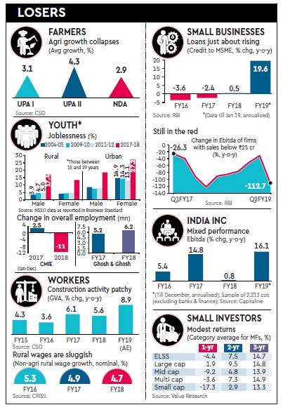 GST was aimed at formalizing the economy and rightly so but some support for was needed for small-scale units. Moreover, given how the delay in refunds to exporters crippled many businesses, it was clear the levy should have been rolled out after more preparation especially since DeMo had already hurt small businesses. The loss of traction in Indian industry is all too visible: growth plunged from 6.3% in November, 2017-October, 2018 to an average of1.5% in the three months to January. Neither has agriculture fared much better, the PM Kisan scheme is evidence there has been little reform although, till recently, BJP ruled 21 states.