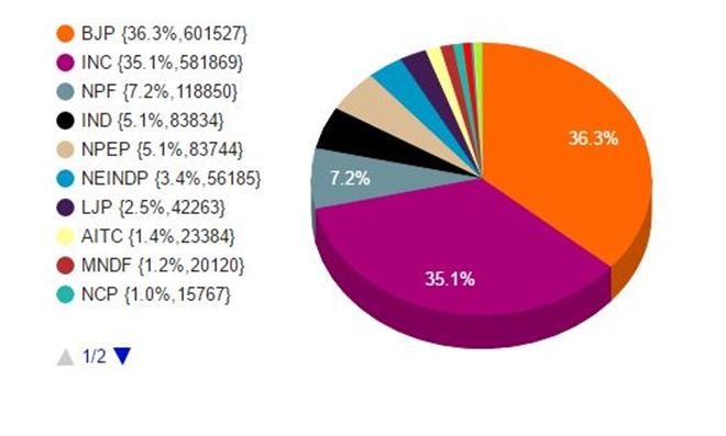 For the first time, BJP has won 21 seats in the north-eastern state with the support of allies. The Congress managed to win 28 seats but in the absence of allies, it seems BJP would manage to form the government in the state. If successful, this will be BJP’s third government in the North East after Arunachal Pradesh and Assam. The saffron party also scored highest voter share (36.3%).