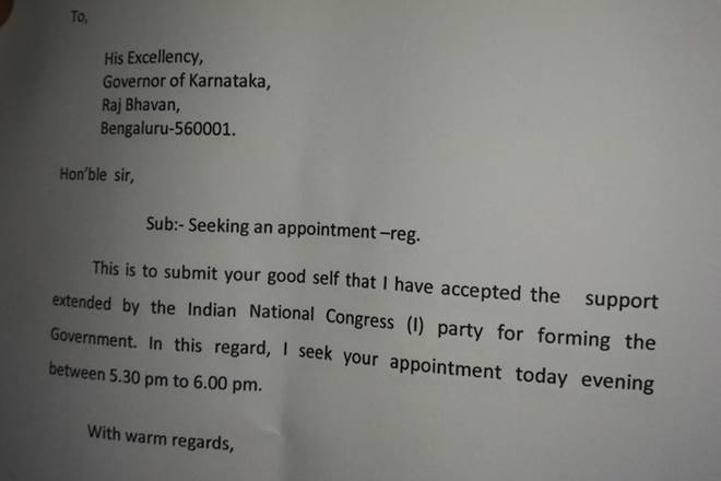 4:25 PM: JD(S)’s HD Kumaraswamy has written a letter to the governor of Karnataka seeking an appointment this evening. In this letter, he wrote that JD(S) have accepted Congress’s support to form the Government.