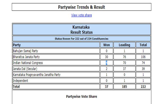 12:18 PM: As per the official Election Commission website, BJP has won on seats. Stay tuned for more Karnataka election results live updates constituency wise.