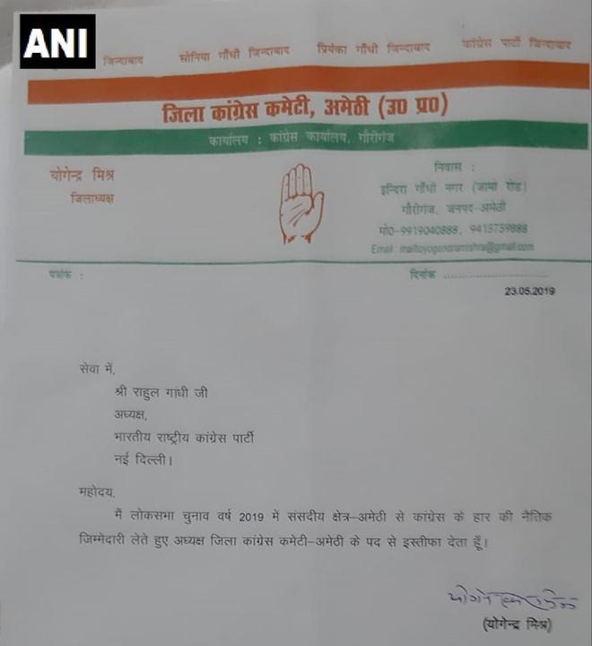 Yogendra Mishra, President of District Congress Committee- Amethi, resigns from the post taking responsibility for the defeat. The Congress lost Amethi seat to BJP's Smriti Irani. She defeated Congress president Rahul Gandhi from here.