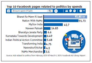 BJP and its affiliate pages continue to be among the top spenders on Facebook while Congress is slowly upping its game. Till March 9, 2019, the total amount spent on Facebook on political advertising and national issues was Rs 5.6 crore, according to public data provided by Facebook. Out of this, BJP and its affiliates accounted for over 50% of political ad spending on Facebook. The top Facebook pages of BJP such as Bharat Ke Mann Ki Baat spent Rs 1.8 crore; Nation with NaMo spent around Rs 91.7 lakh and My Gov India spent Rs 42.7 lakh. Pro-Congress pages have officially made an entry, though the party is still behind the pages of regional parties like Biju Janata Dal and Karnataka government. The key Facebook pages of Congress are Konda Vishweshwar Reddy (Rs 1.9 lakh), Indian Youth Congress (Rs 28,542), the page for Congress MP Milind Deora (Rs 33,000) and Congress My Voice — Odisha Manifesto (Rs 60,134).