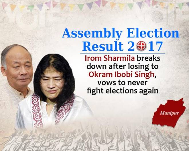 12: 30 PM: Irom Sharmila’s battle against AFSA lasted for almost 17 years but her crushing loss in Manipur yesterday where she failed to get more than 100 votes show that probably AFSA isn’t even a issue for the people. However, another reason for her less could be that she wasn’t contesting from a major party and couldn’t have formed the government in any case.
