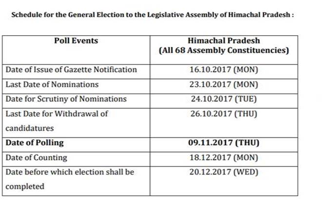Himachal Pradesh Assembly elections 2017: The northern state of Himachal will go to polls on November 9. In an announcement made by the Election Commission recently, the state will see a single phase voting with results to be declared on December 18. The polling process in the state will begin on October 16, after the gazette notification is issued. After this filing of nominations will take place. The election has to be completed before December 20.