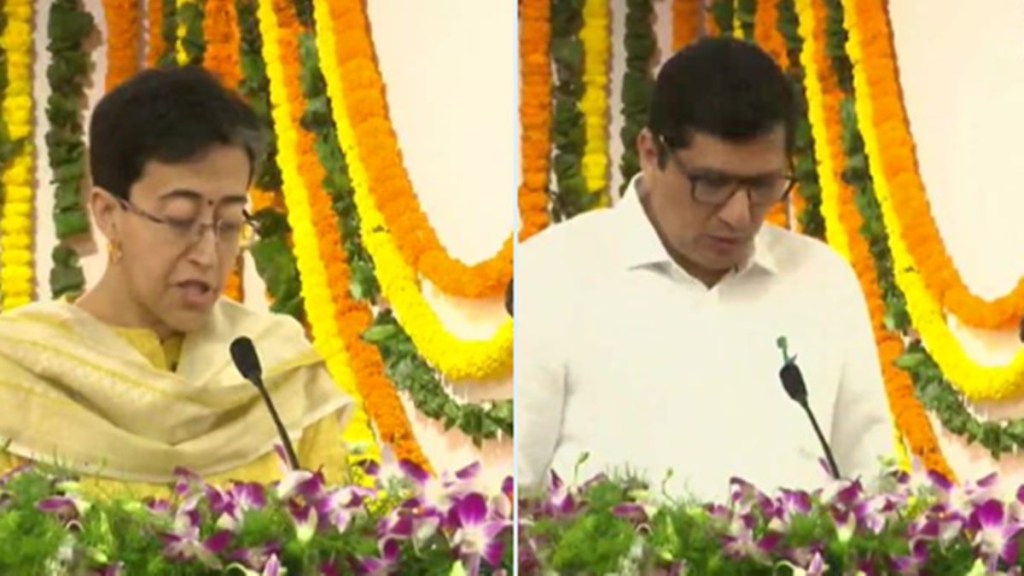 Aam Aadmi Party (AAP) legislators Atishi and Saurabh Bharadwaj took oath as ministers in the Delhi Cabinet on Thursday in the presence of Chief Minister Arvind Kejriwal and Lieutenant Governor V K Saxena. The governor administered the oath to office to the new ministers at the Auditorium at Raj Niwas.