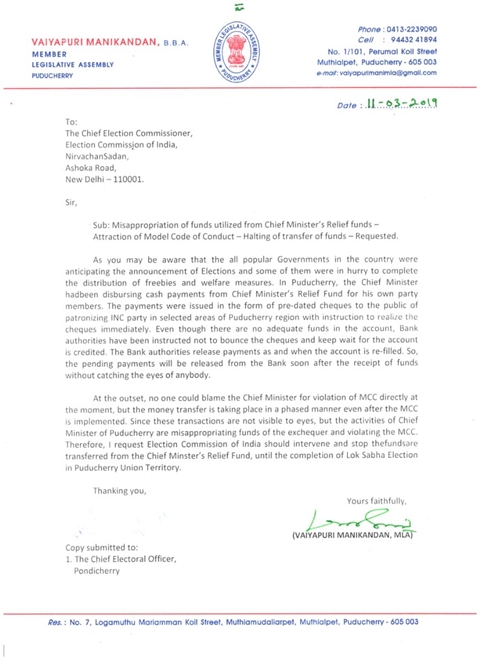 AIADMK wrote that Puducherry Chief Minister V Narayanasamy was misusing the funds from the Chief Minister’s Relief funds and was giving the money “to his own party members.”
