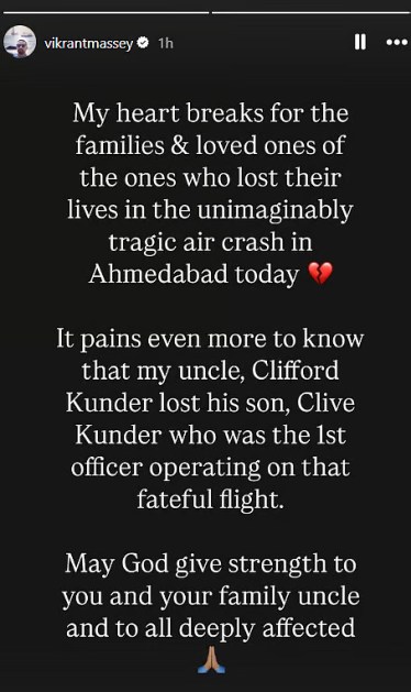 Massey took to his Instagram story and shared his grief. “My heart breaks for the families & loved ones of the ones who lost their lives in the unimaginably tragic air crash in Ahmedabad today,” he wrote. “It pains even more to know that my uncle, Clifford Kunder, lost his son, Clive Kunder, who was the 1st officer operating on that fateful flight.” The “12th Fail” actor extended his condolences, adding, “May God give strength to you and your family, uncle, and to all deeply affected.”