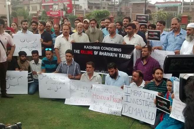 Amarnath Yatra Attack: Members of civil society, trade and tour organisations staged demonstrations across Srinagar against the killing of seven Amarnath pilgrims in Anantnag and sought an impartial probe into the terror attack. Representatives from the Jammu and Kashmir Coalition of Civil Society (JKCCS), Centre for Research and Development Policy (CRDP) and Kashmir Traders and Manufacturers Federation (KTMF) assembled at Pratap Park near the city centre, Lal Chowk, to raise their voice against last night’s “barbaric” and “gruesome” killings. Khurram Parvez, coordinator of JKCSS, condemned the killings and sought an impartial probe by the United Nations Human Rights Council (UNHRC) into the attack.