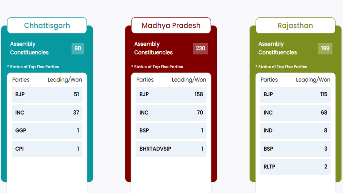 The BJP appears to have made significant gains in the elections in the three Hindi-heartland states. The party, which fought the elections with Prime Minister Narendra Modi as its face in all three states. The party seems to have reversed its losses in 2018 polls and is comfortably leading in Rajasthan, Madhya Pradesh and Chhattisgarh.