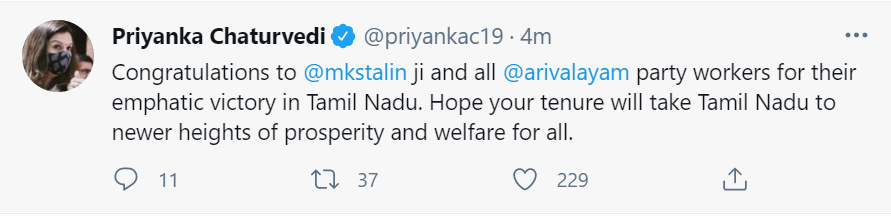 Tamil Nadu Election Results Live: Shiv Sena Rajya Sabha MP Priyanka Chaturvedi congratulates MK Stalin