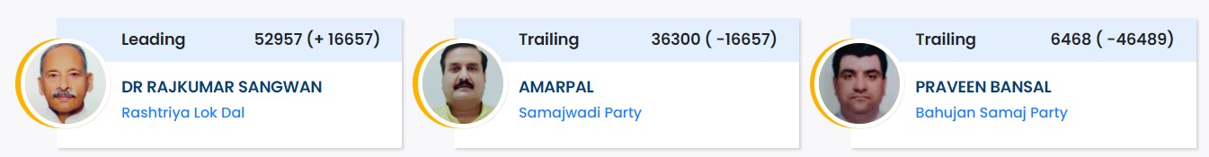 Rashtriya Lok Dal candidate Dr Rajkumar Sangwan is currently maintaining its lead over Samajwadi Party's Amarpal and BSP candidate Praveen Bansal. Sangwan is leading by a margin of over 46000 votes.