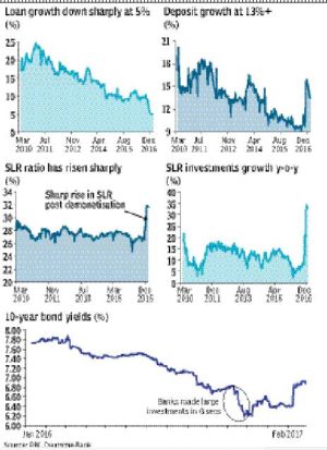Post demonetisation, the banking system witnessed a sharp surge in deposits, which were used to buy bonds by almost all banks. Deposit growth in Q3 was 3-10% q-o-q for banks, driving growth in the investment book to 10-30% q-o-q. System loan growth at 5% remains extremely weak. While banks bought GSecs at yields of 6.2-6.4%, the yields are currently at 6.9%. Also, investment yields for most banks have now come down to nearly 7% and it is very likely that incremental bond gains will be limited.