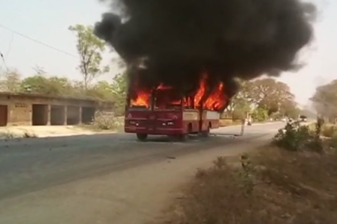 3:01 PM: Bus was vandalised and set ablaze in UP’s Azamgarh during protest over SC/ST Protection Act by Dalits.