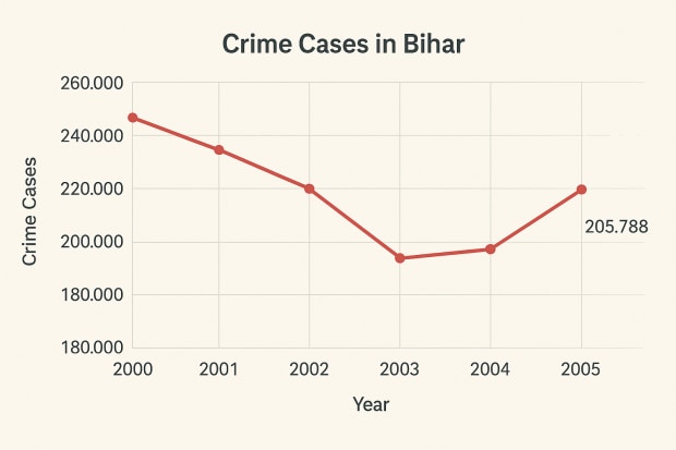 From 2005 to 2015 the NCRB and Bihar Police data suggests 1.68 lacs average cognizable crimes per year. In the last decade the crime rate has surged significantly to 2.66 lacs per year