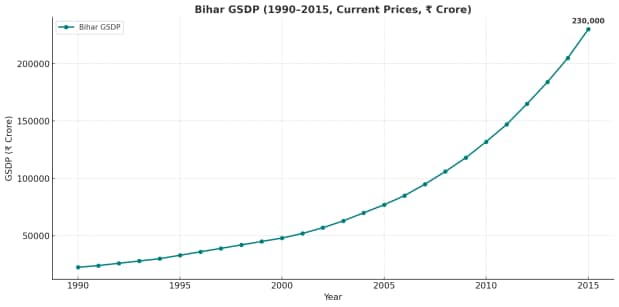 The per-capita income during 1990-91 was approx. Rs 2,660, which increased to Rs 7,914 in 2004-05. In 2023-24, the per capita income in Bihar was Rs 36,333 at constant prices and Rs 66,828 at current prices, according to the Bihar Economic Survey 2024-25 tabled in the assembly in February this year.