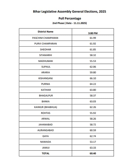 The voter turnout till 3 pm in Bihar election 2025 phase 2 was 60.40%, and the district-wise breakdown for the same is as follows -